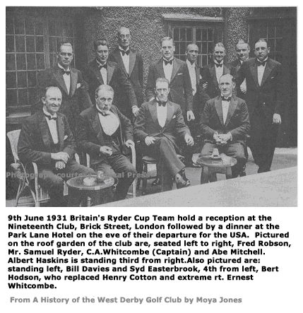 Ticket for Albert Haskin's Benefit DayBy the time of the next match in England I would be in the reckoning. A Ryder Cup selector appears in a picture with members of that 1931 team (below), Albert Haskins, professional at Liverpool’s West Derby club for forty years. He was to play a part in the final chapter of my attempt to follow brother George into the Ryder Cup record books, but a lot of water was to go under the bridge before then.